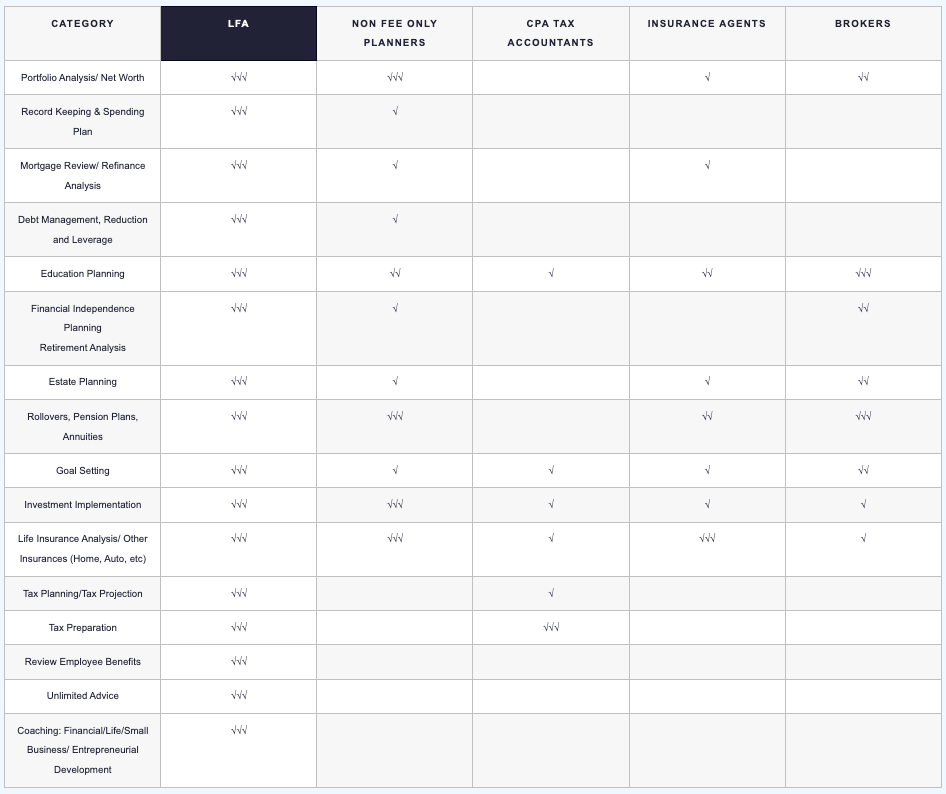 CATEGORY | LFA | NON FEE ONLY PLANNERS | CPA TAX ACCOUNTANTS | INSURANCE AGENTS | BROKERS |